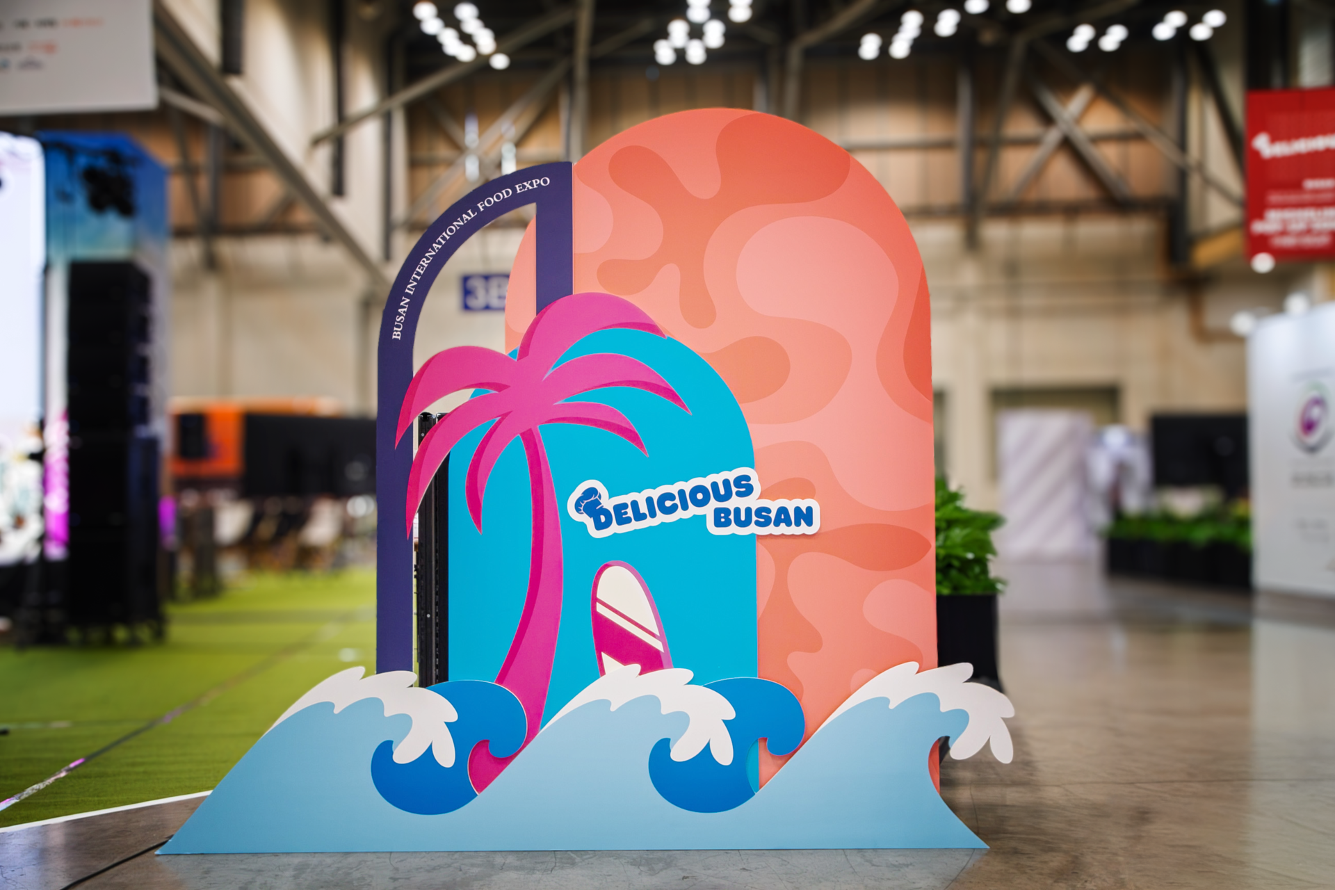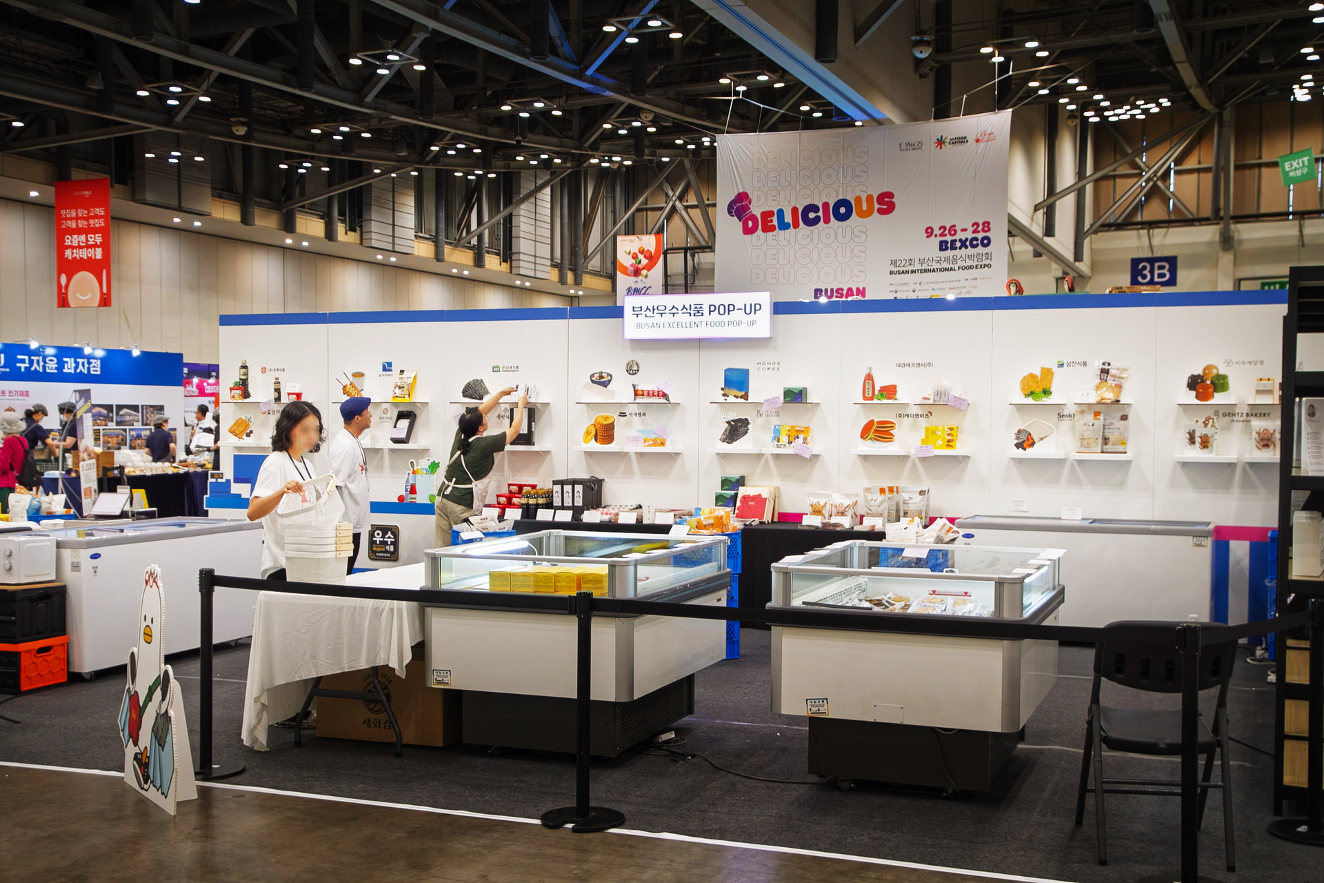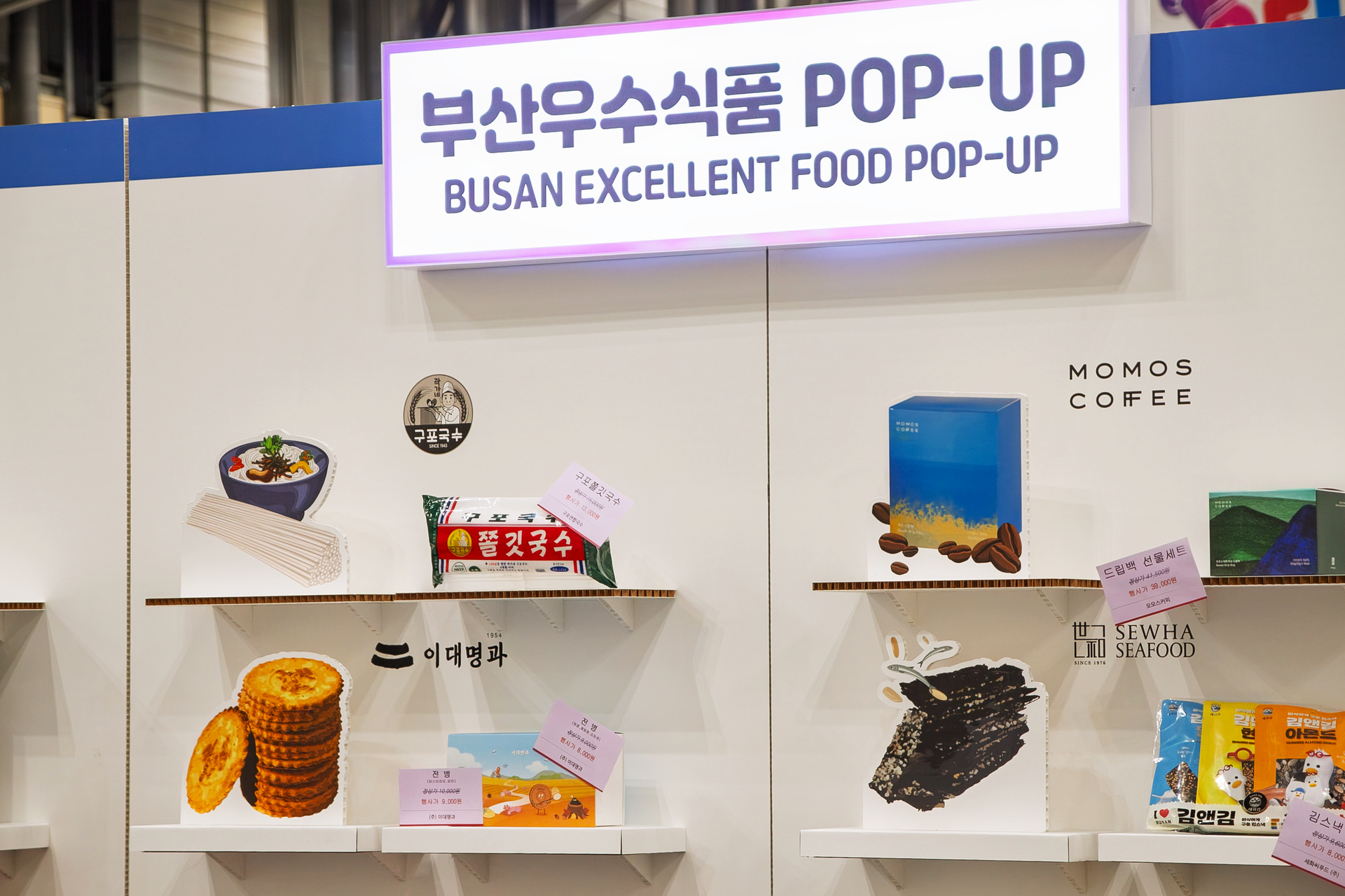 부산국제음식박람회 내 부산우수식품 POP-UP 전시는 지역을 대표하는 식품 브랜드를 한 공간에서 소개하고, 관람과 체험, 구매까지 자연스럽게 이어지도록 구성된 전시입니다. 허니콤보드를 활용한 진열대와