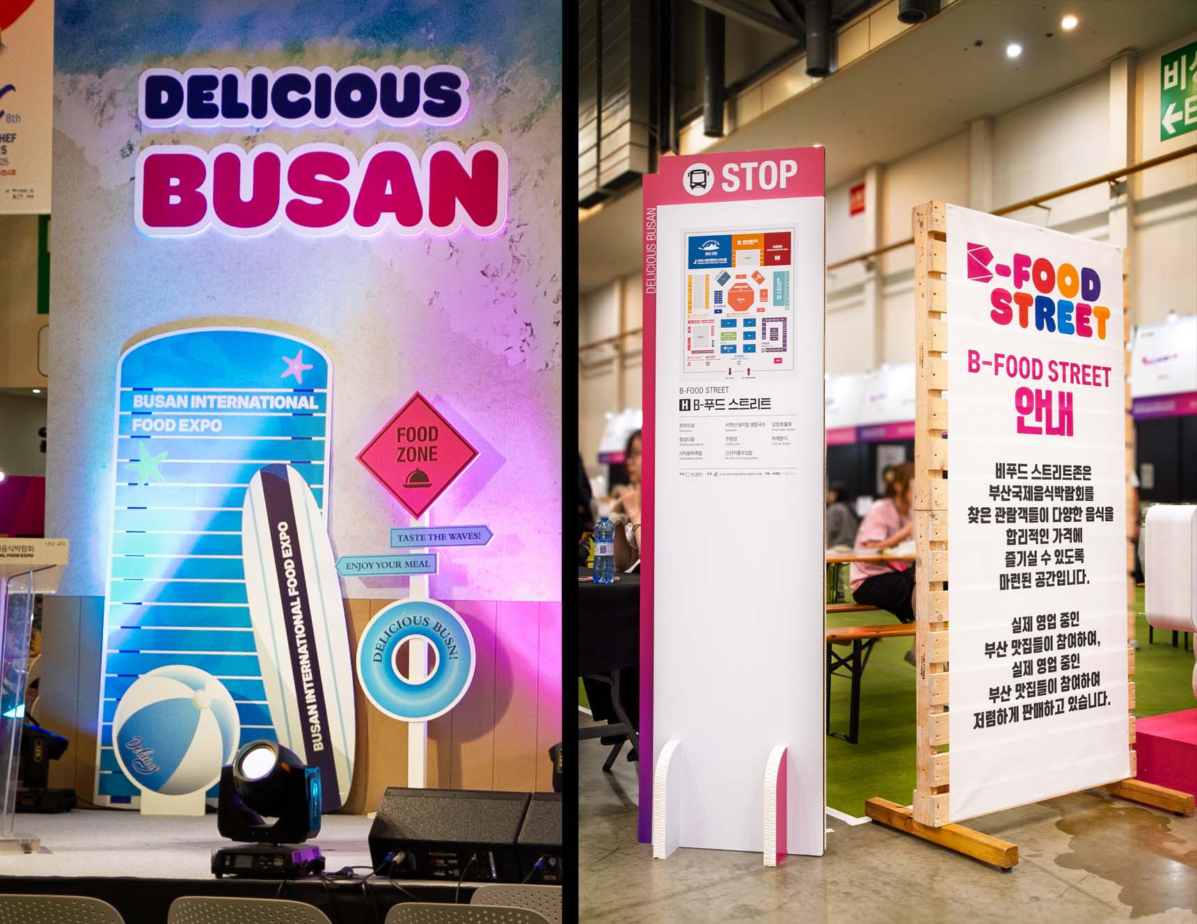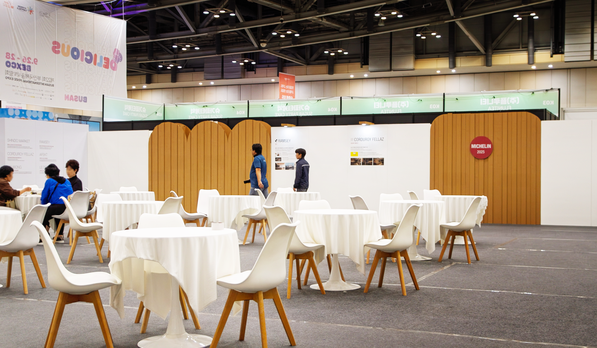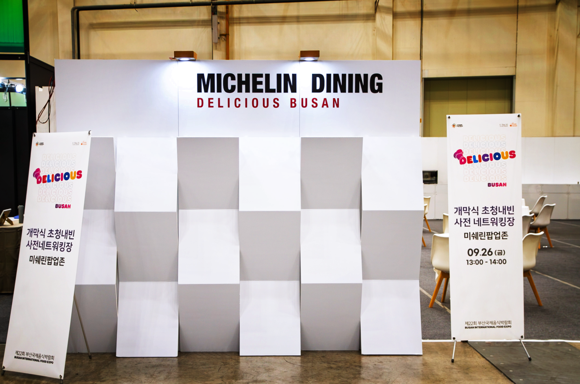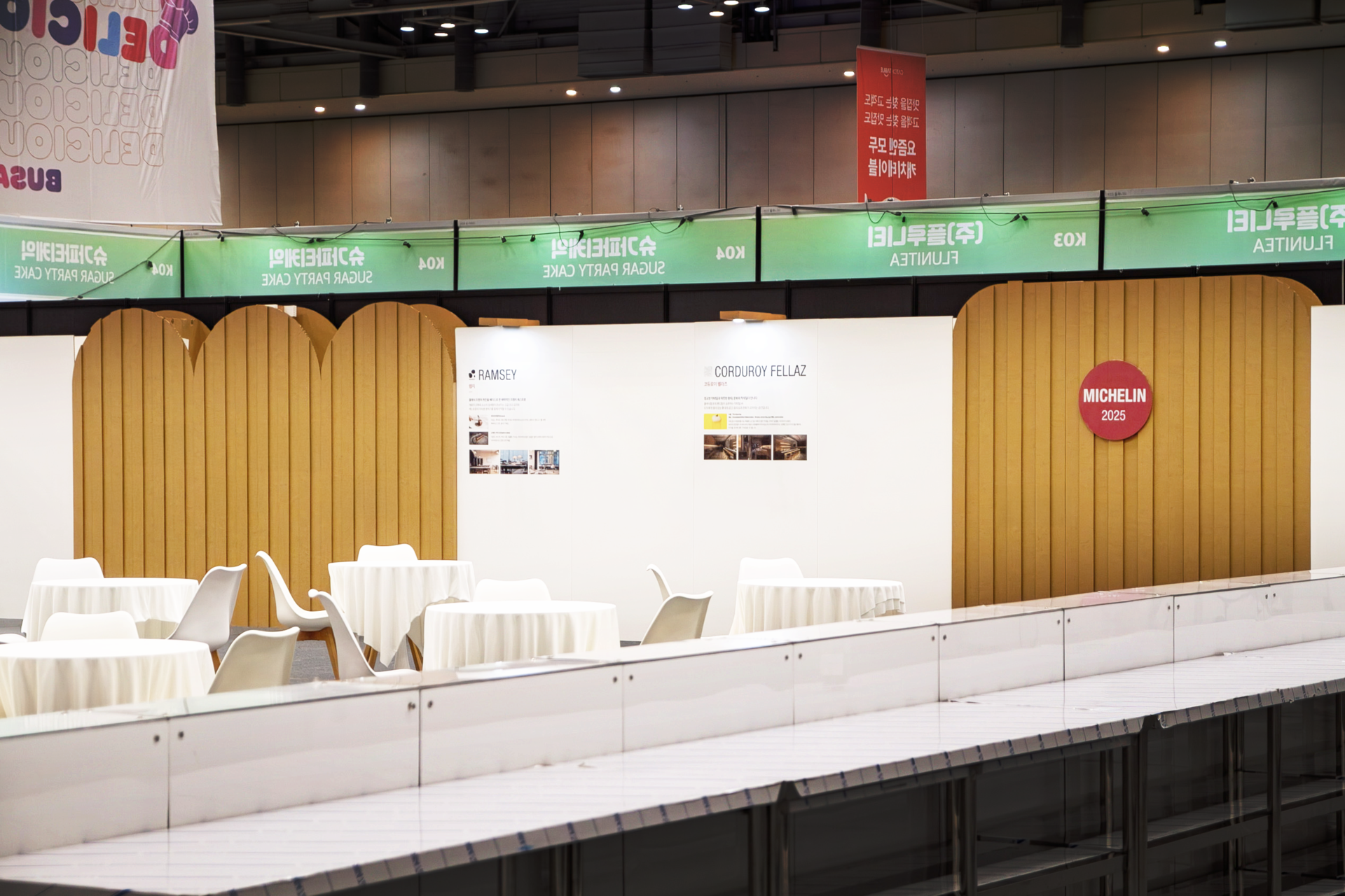 미쉐린 팝업존은 부산의 식문화 경쟁력과 브랜드 가치를 집중적으로 보여주는 프리미엄 전시 공간으로 구성되었습니다. 허니콤보드 가벽 구조를 활용해 공간을 유연하게 구획하고, 전시 동선에 따라 자연스럽게
