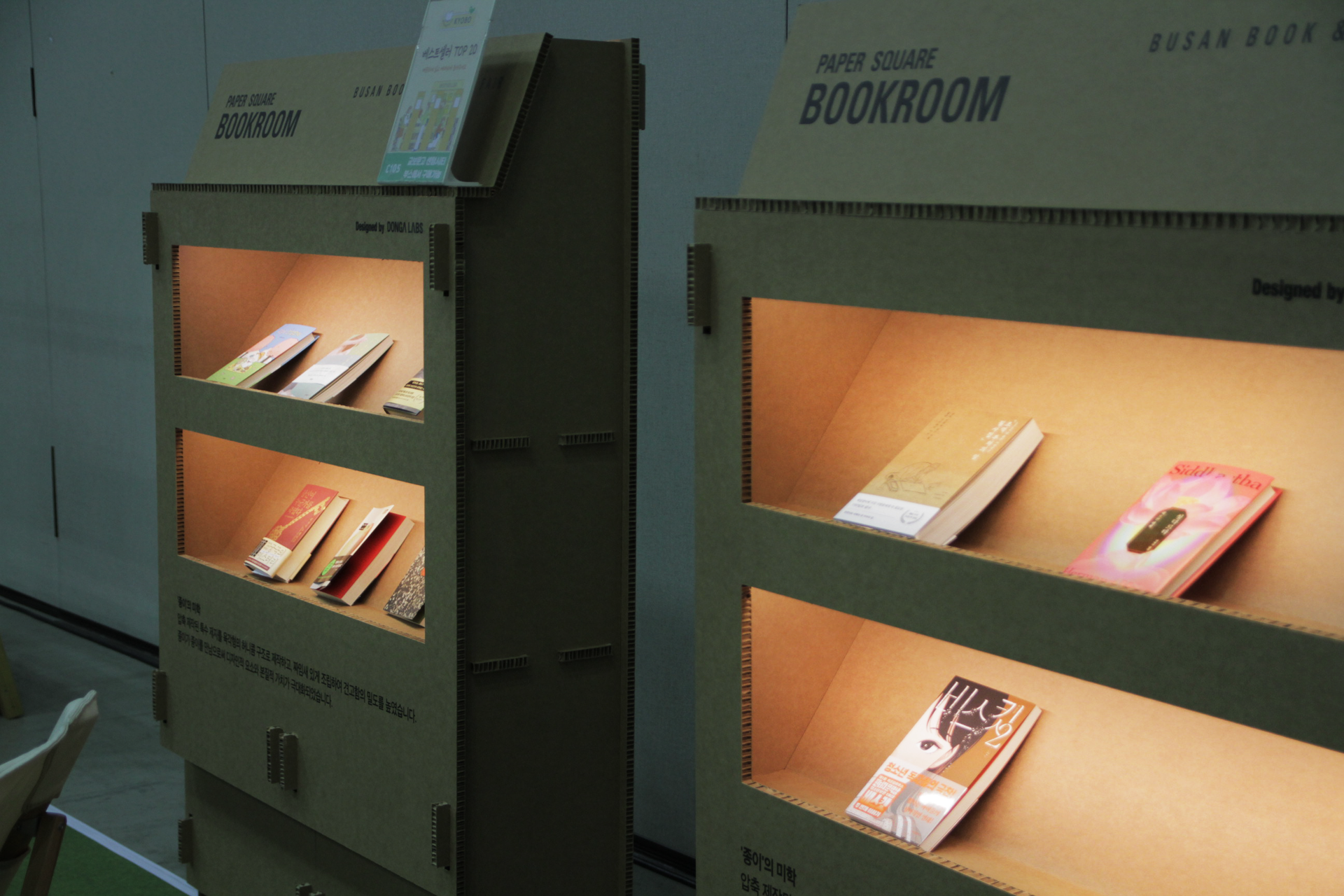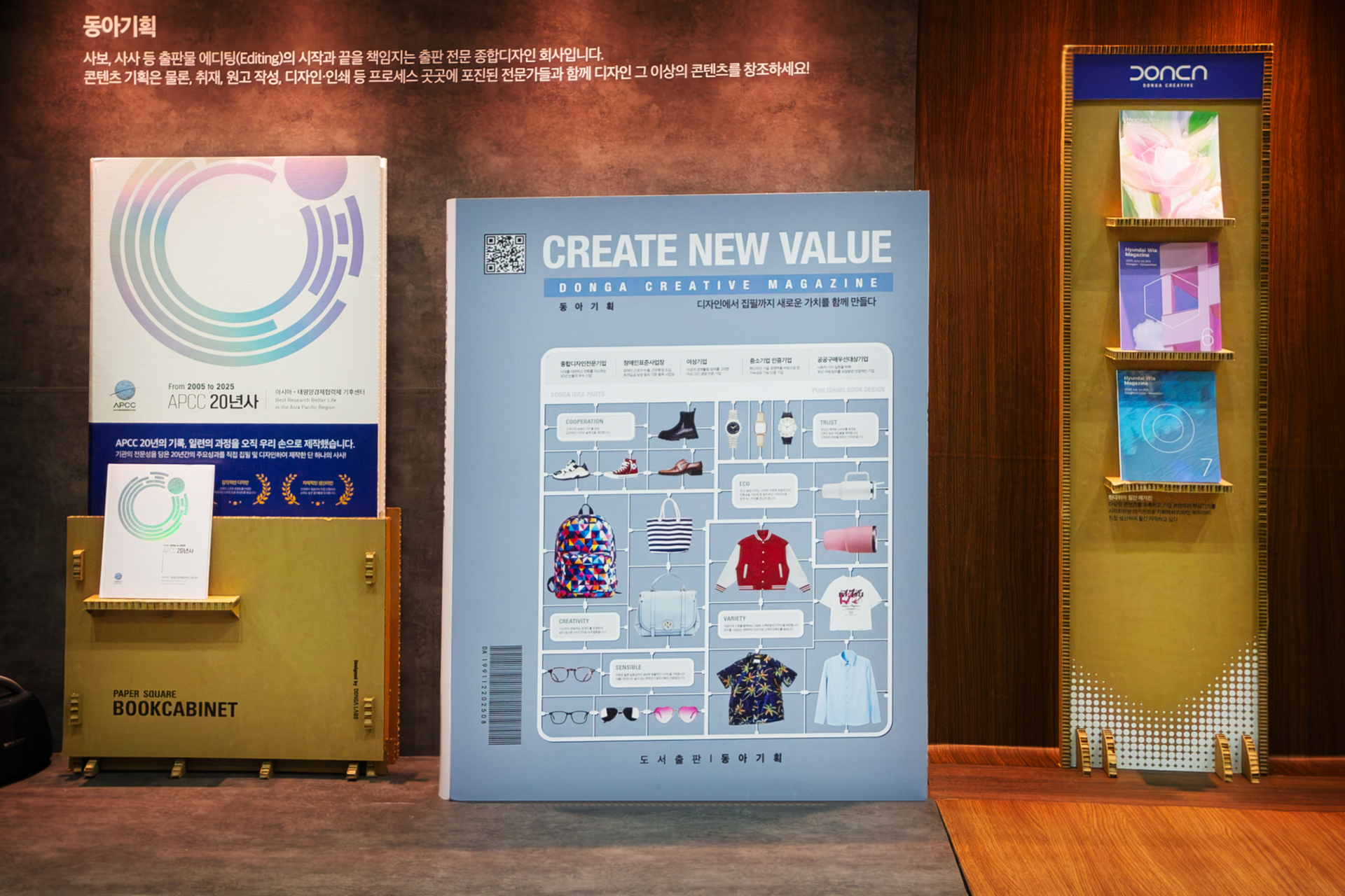 북앤콘텐츠 전시에서는 공공 도서 공간에서 활용 가능한 전시형 서가와 콘텐츠 공간을 제안하는 북룸(Book Room)과 동아랩스 전시 부스를 제작했습니다.