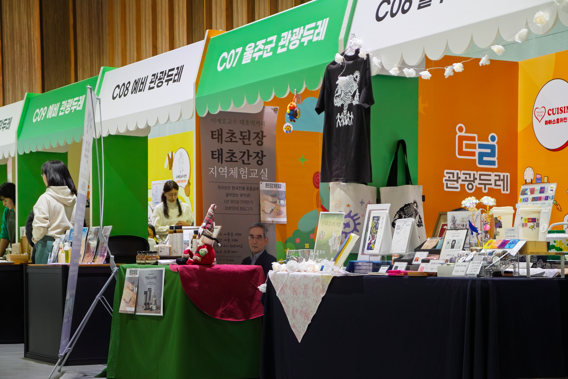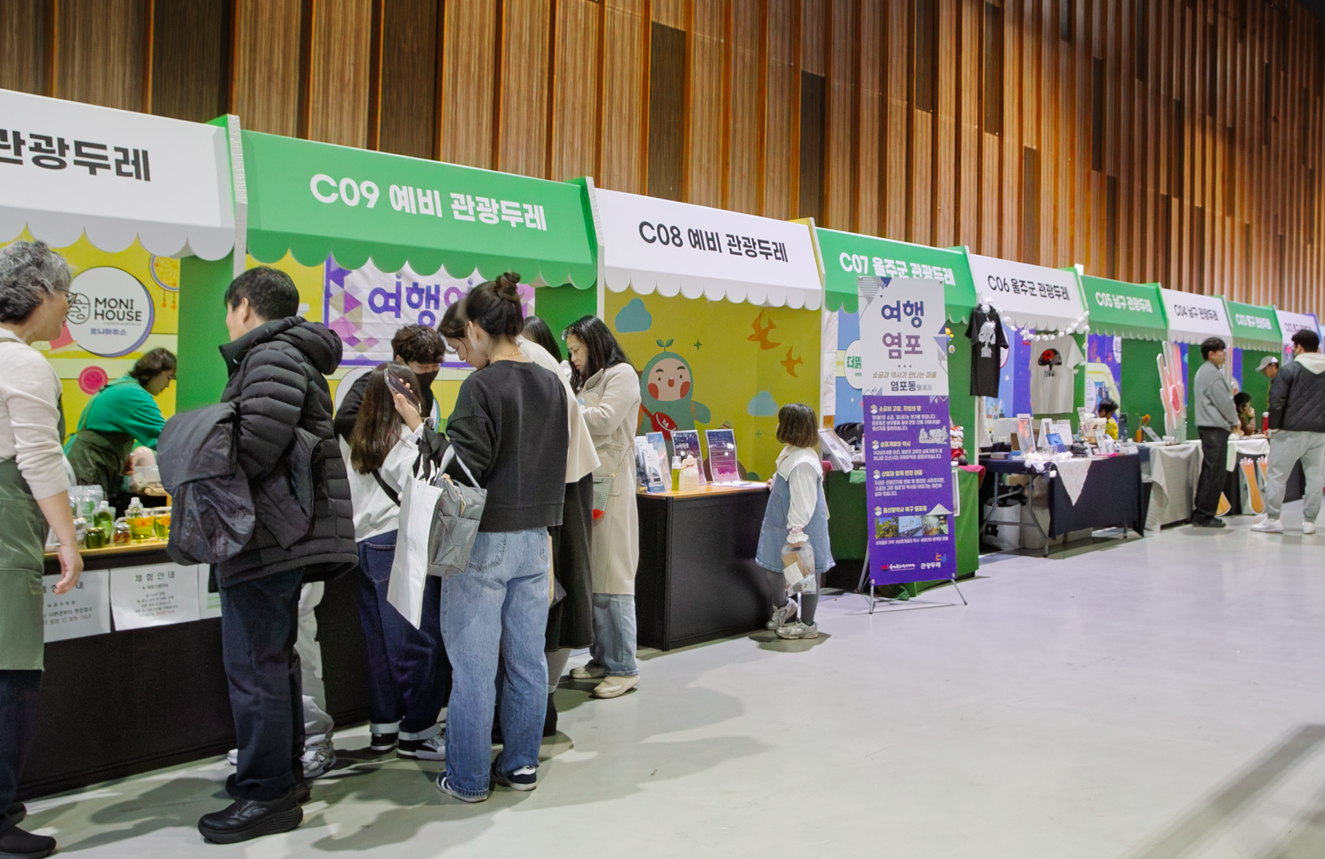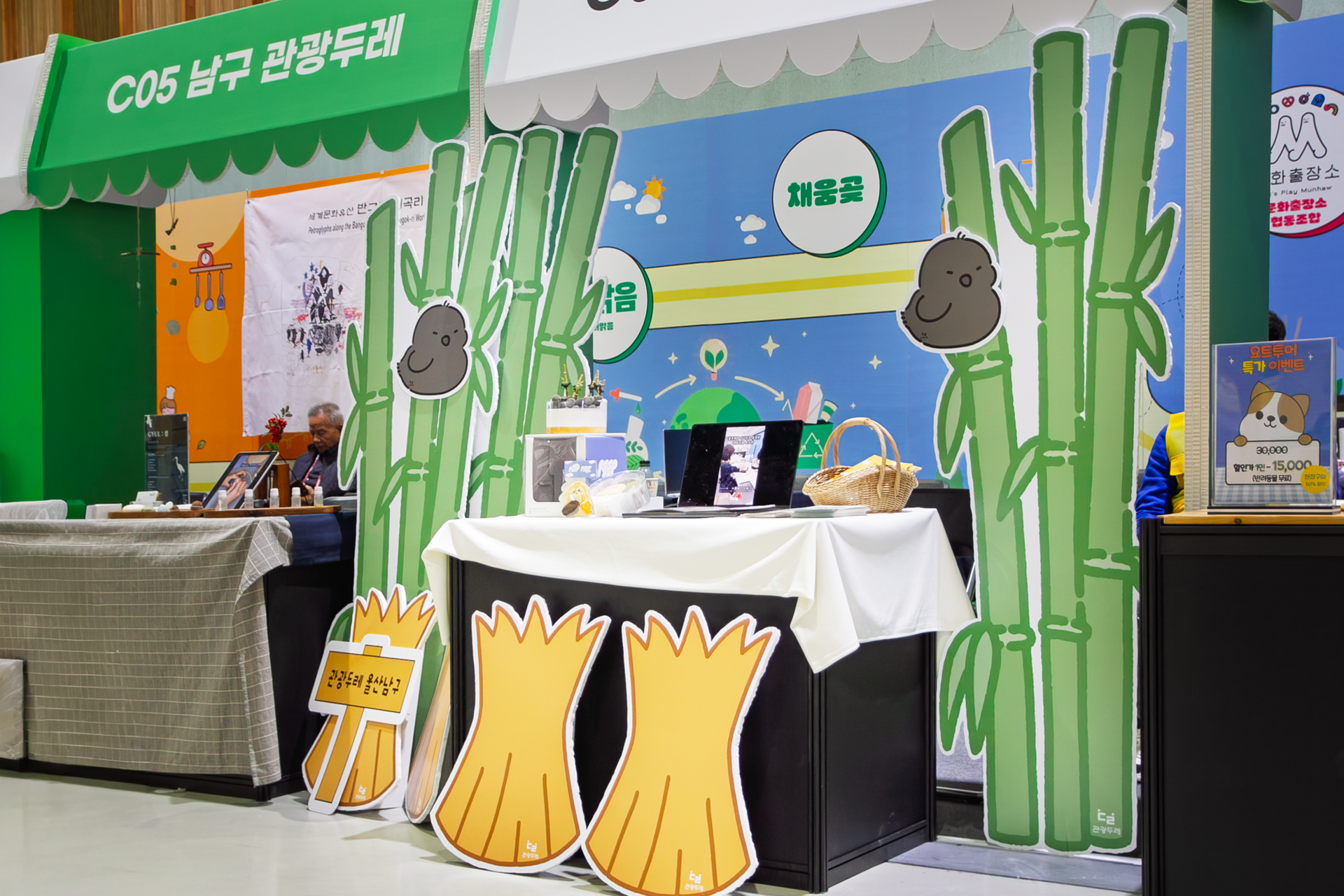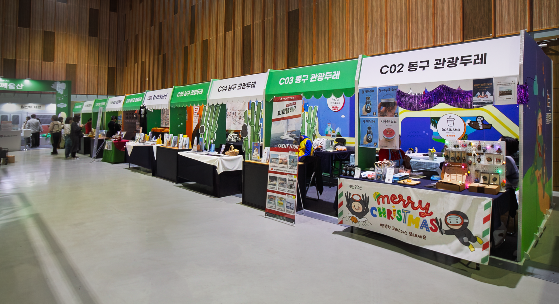 울산 관광두레 부스는 지역 주민이 주체가 되어 만든 관광 콘텐츠와 상품을 한 자리에서 소개하는 공공 프로젝트입니다. 다수의 참여 부스가 연속으로 배치되는 구조를 고려해 허니콤보드 기반의