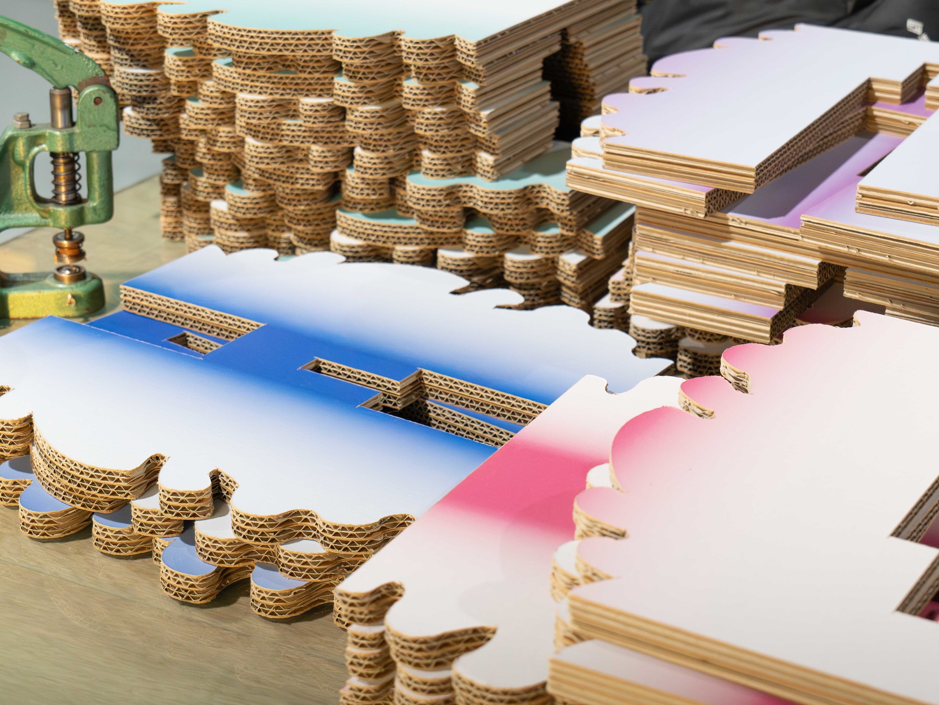 하나의 세트처럼 공간에 어우러지도록 구성했습니다. 허니콤보드 소재를 사용해 가볍지만 안정적인 구조를 구현했으며, 해체·조립이 가능한 방식으로 해외 운송과 설치에 효율적으로 대응했습니다.