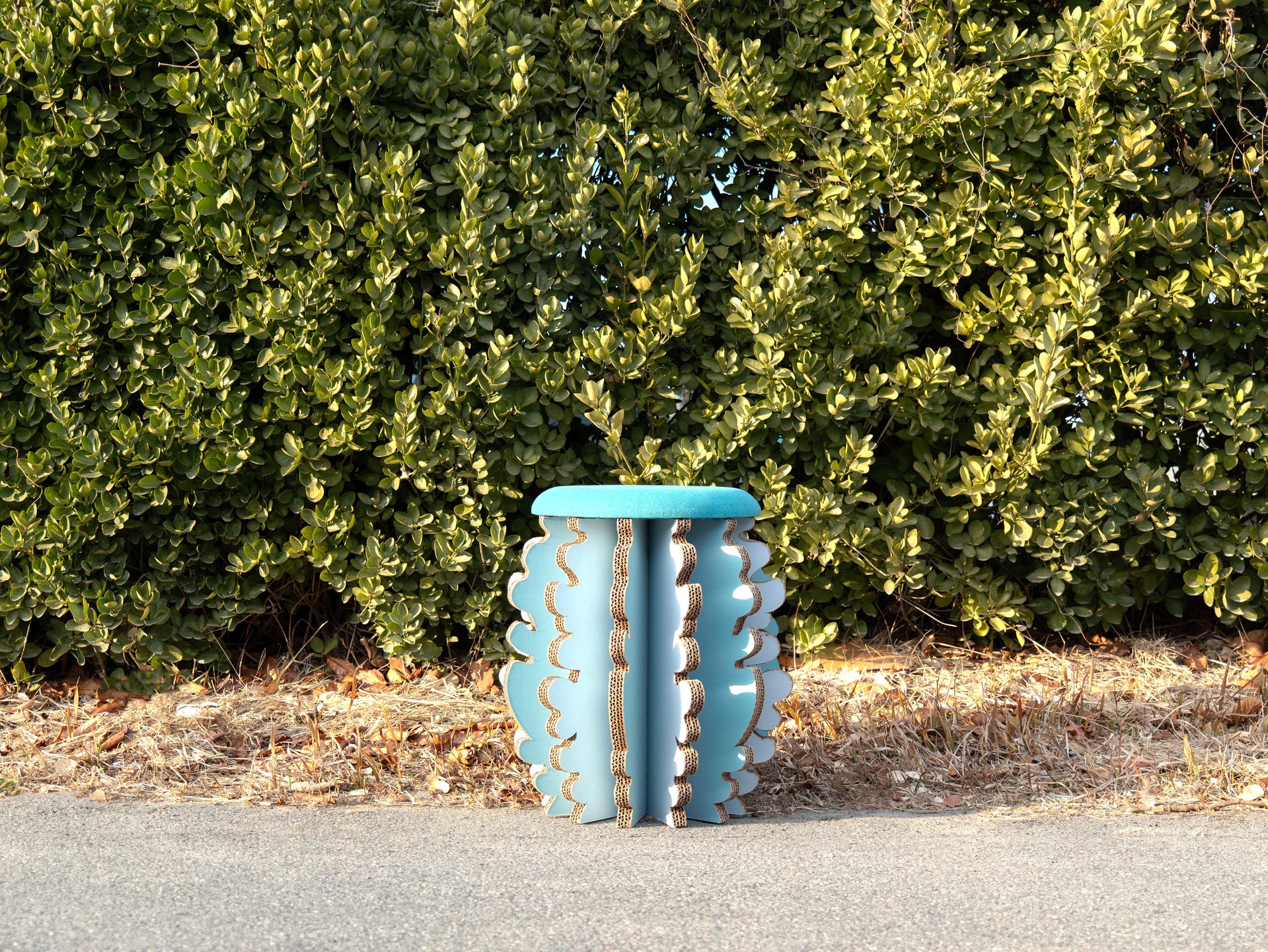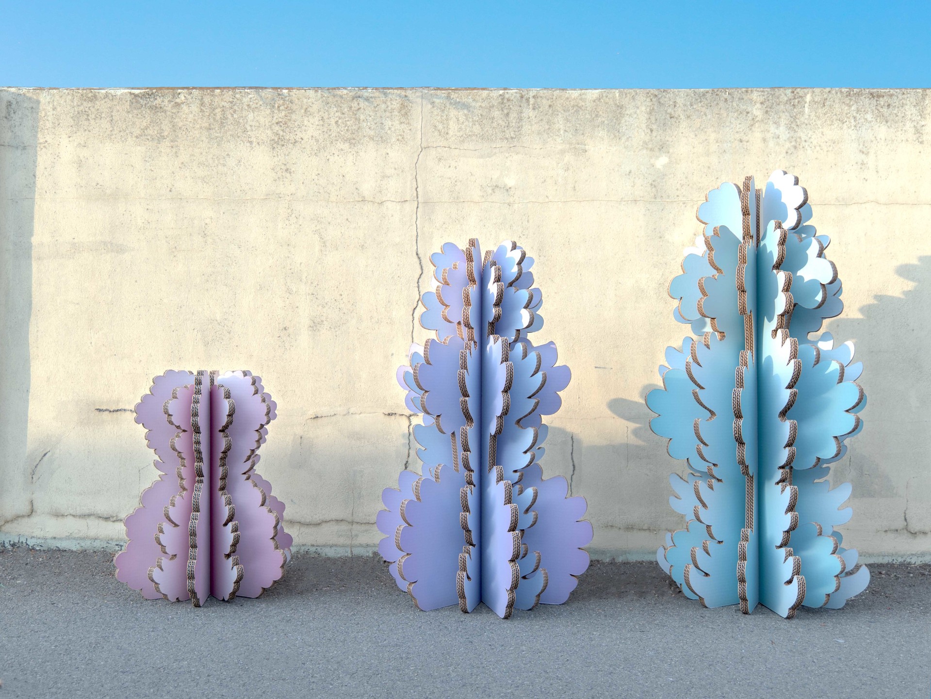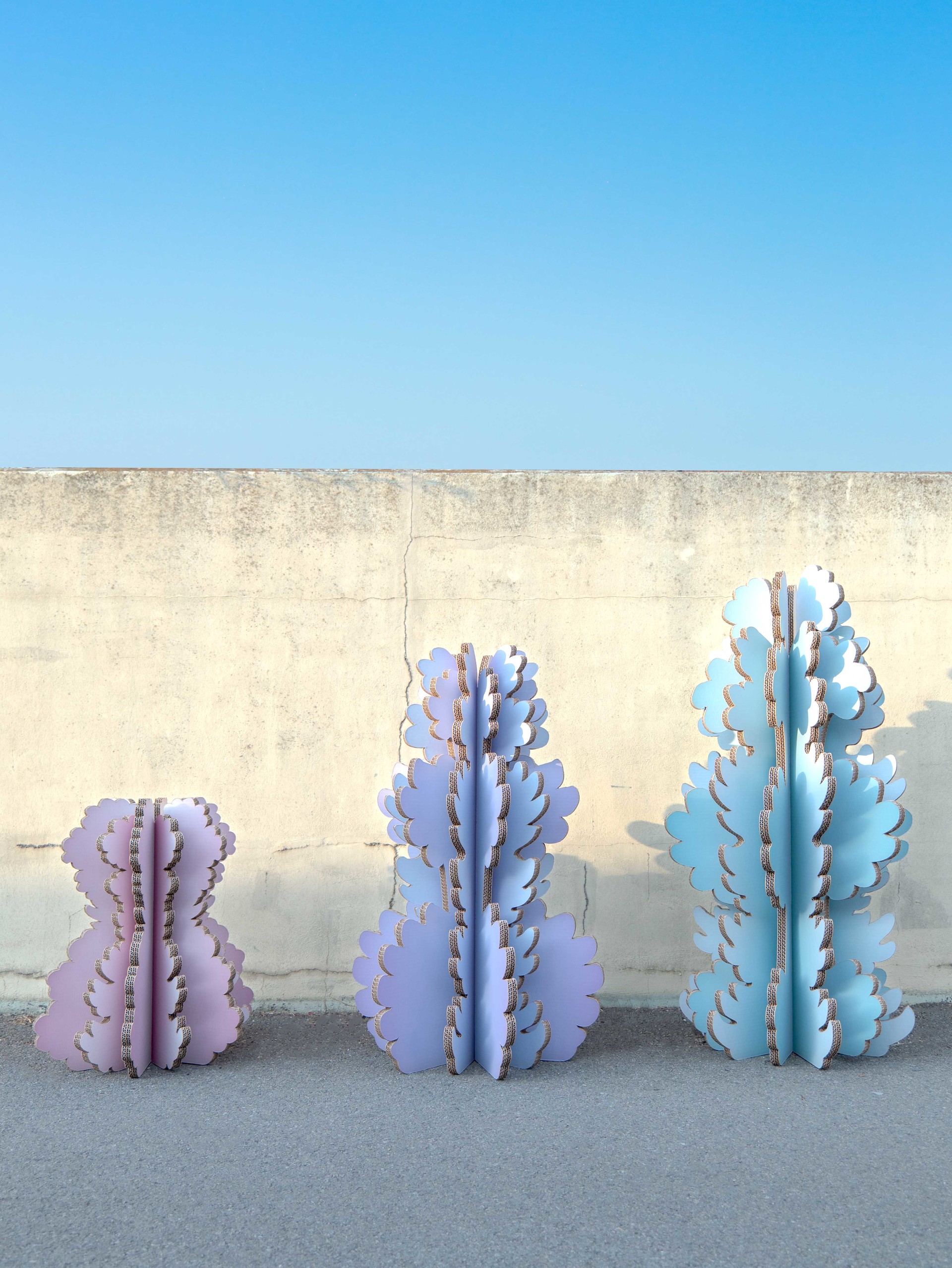 나무 조형물은 세 가지 크기로 구성되어 공간의 규모와 연출 의도에 따라 유연하게 배치할 수 있도록 설계되었습니다. 함께 제작된 스툴 역시 동일한 구조 시스템을 적용해 조형물과